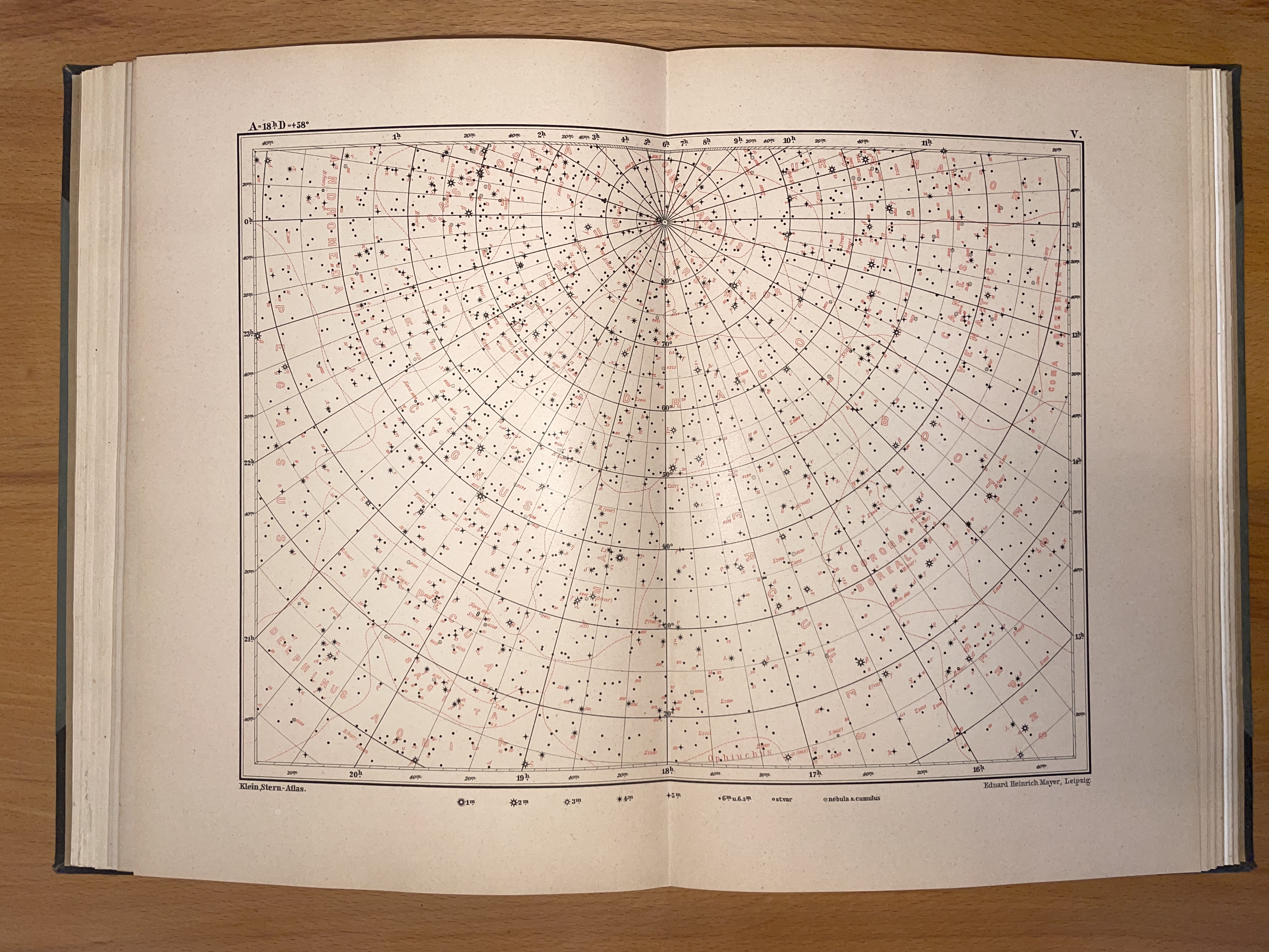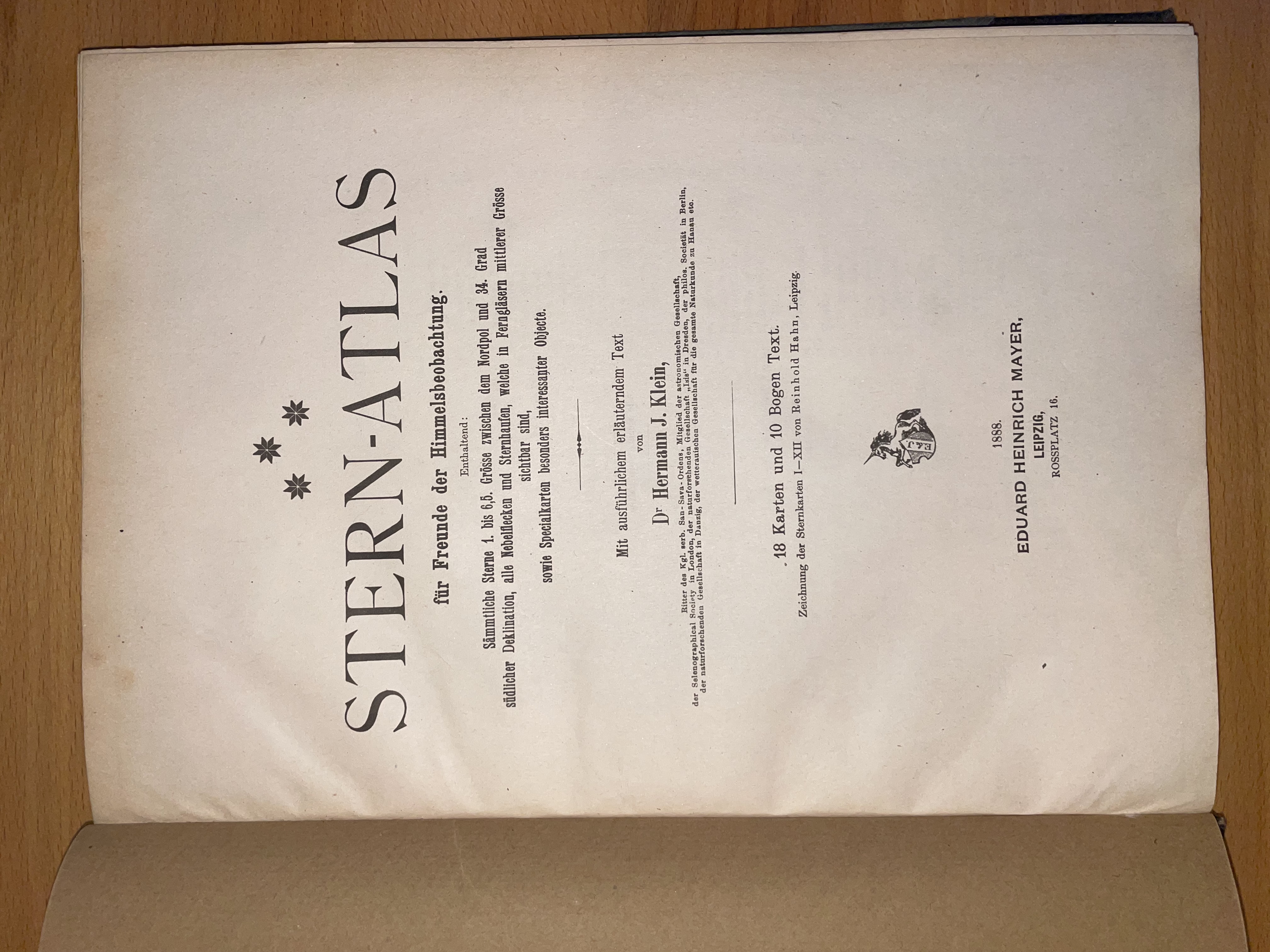 Dieser Sternatlas stammt aus der Zeit vor 1923. Im Jahr 1923 gab es eine Sternbildreform, wo der Sternhimmel einheitlich in 88 (89) Sternbilder aufgeteilt wurde. Es wurde ein wissenschaftlicher, weltweit einheitlicher Sternhimmel geschaften, der an allen Lehrstühlen und Sternwarten Anwendung finden sollte und auch hat. Daher enthält dieser Sternatlas auch Sternbilder, die es jetzt nicht mehr giebt. Dazu zählt "der Sorbieskische Schild" , heute nur noch "Schild". Es gibt in anderen Sternatlanten auch noch andere Sternbilder aus dem deutschsprachigen Raum, dazu mehr in den anderen Sternatlanten. |
